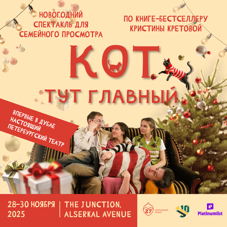 – Language: French How to get there: By car: Al Serkal Avenue is located in the Al Quoz industrial area of Dubai, and it can be easily reached by car. If you’re coming from Sheikh Zayed Road, take the Al Manara exit (exit 43) and turn right onto Al Manara Street. Continue straight until you reach the first intersection and turn right onto 8th Street. Keep driving straight until you reach the roundabout, take the second exit, and continue onto 17th Street. You’ll find Al Serkal Avenue on your left.   By public transportation: To reach Al Serkal Avenue by metro, take the Dubai Metro Red Line and get off at the Noor Bank Station. From there, you can take a taxi or a bus to Al Serkal Avenue, which is just a short drive away.   By taxi: You can also take a taxi to Al Serkal Avenue from anywhere in Dubai. It’s a famous destination and most drivers would be familiar with its location. Настоящий петербургский театр для семейной аудитории — впервые в Дубае. Любовь. Программирование. Новый год. Котики. По мотивам книги-бестселлера «Кот и Новый год» писательницы Кристины Кретовой, автора более 25 книг для детей. «КОТ ТУТ ГЛАВНЫЙ» От «Театрального проекта 27» — лауреата Большого Детского фестиваля, трёхкратного лауреата премии «Арлекин», номинанта премии «СНОБ. Сделано в России». «Кот тут главный» — это нетипичная новогодняя история-сказка, это спектакль, приглашающий к важному разговору. Мы не утомим назидательностью или серьёзностью — в спектакле есть место и смешным шуткам, и трогательным моментам. Через историю отношений мамы, подростка и кота спектакль исследует темы принятия и любви. Это рассказ о том, как семья остаётся точкой опоры, которая помогает справляться с жизненными вызовами и переменами. Кот. Семья. Новый год. Волшебство. Спектакль “Кот тут главный” at The Junction in Dubai at Unit H72, Alserkal Avenue, 17 St. Corner 8 St, 1 17th St, القوز, دبي, United Arab Emirates events Shows and Theatrical Plays The Junction