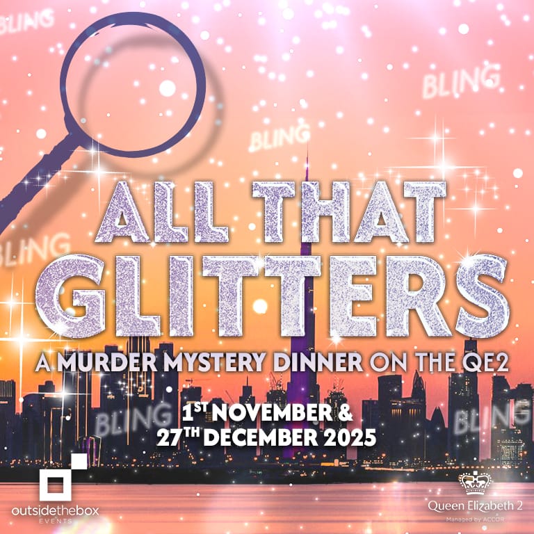 – Lights! DUBAI! Action! BLING! Murder… Dubai’s most glitzy murder mystery returns to the QE2 in November 2025. Written by the fiendishly clever Moxie Anderson and directed by Dubai’s leading theatrical director, Alex Broun. Fresh from its smash-hit sell-out world premiere at the Emirates Airlines Festival of Literature earlier this year, this all-star murder mystery will make sure the world of reality television is never the same again! What happens when you combine a cast of overly dramatic celebrities all convinced of their own greatness, an ambitious and controlling director, a long-suffering assistant, and a locked-down film set? Sounds familiar…? Oh, and did we mention the dead body? In this glittering murder mystery, everyone has a motive and no one is safe. As the bodies continue to pile up, only one thing is certain: someone is getting ready for their close up. Will you solve the mystery? Or will you be wrongfully accused? Perhaps we’ll find out that it was you all along. In any case, you’re invited to a dinner with the stars of All That Glitters! Also don’t miss our other smash hit murder mystery Dinner with a Clue… at the QE2! The Grand Lounge opens at 7pm, shows start at 8pm Sharp. Prize giving at approximately 10pm for – best dressed guest; – most accurate detective work; and – most creative crime-solving detective work. All That Glitters Murder Mystery Dining Experience on The QE2 at Queen Elisabeth 2, Port Rashid, Dubai, United Arab Emirates events Dining Experiences Grand Lounge, Upper Deck – QE2
