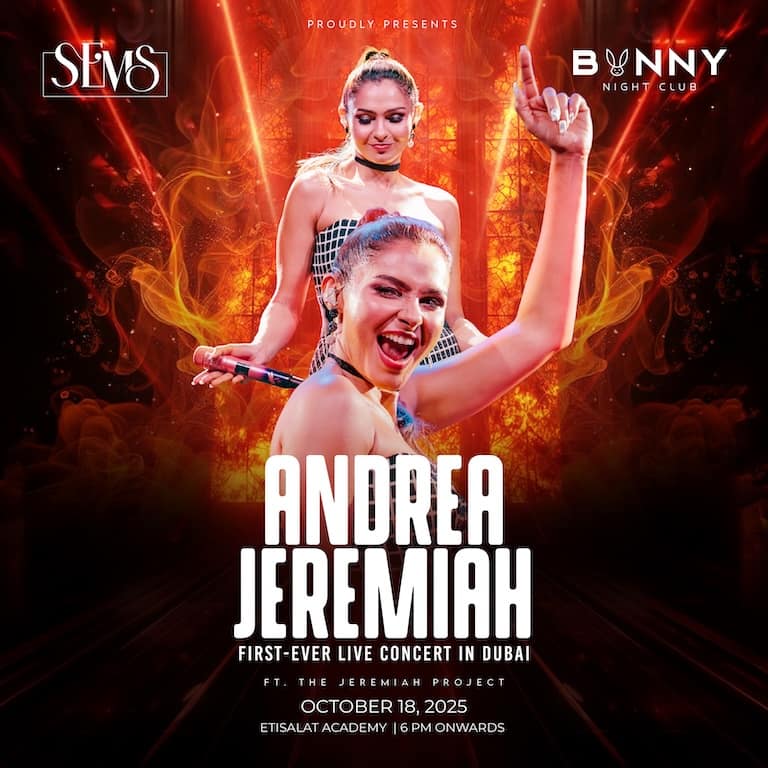 – Andrea Jeremiah Live in Dubai FT. the Jeremiah Project is set to be one of the most anticipated South Indian musical concerts of the year. Taking place on October 18, 2025 at the Etisalat Academy Sports and Leisure Club, the event will feature the sensational Andrea Jeremiah performing her biggest hits live. Known for her captivating stage presence, soulful voice, and versatility as a performer, Andrea is ready to create an unforgettable evening for her fans in Dubai. The concert promises a spectacular production setup with First-class sound, lights, and immersive visual experiences, bringing audiences closer to the magic of live music. With a diverse setlist covering Tamil, Malayalam, and multilingual hits, Andera Jeremiah Live will unite music lovers from across the region for a night of rhythm, energy, and celebration. Get ready to sing along, dance, and be part of a truly electrifying musical journey! Andrea Jeremiah Live Ft. The Jeremiah Project at Etisalat Academy in Dubai at Etisalat Academy, Exit 60, E311, Dubai, United Arab Emirates events Concerts Etisalat Academy Andrea Jeremiah