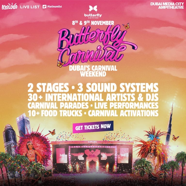 – The wait over! Butterfly Carnival returns on November 8-9 for Dubai’s biggest carnival weekend with breath-taking carnival parades, over 30 international artists & DJs across two mega stages, three sound systems, immersive carnival activations and mouth-watering food from around the world. Get ready for an even bigger, brighter and more phenomenal carnival experience infused with the world’s greatest carnival celebrations from London’s Notting Hill ground-shaking sound systems to the hypnotic vibes of Caribbean Carnival, the massive energy of Jamaica’s largest festival, Dream Weekend to the spirit of Brazil’s Rio’s samba parades. This year’s edition will see the transformation of Dubai Media City Amphitheatre into a pulsating global carnival village. Butterfly Carnival 2025 at Media City Amphitheatre, Dubai at Media City , Dubai, United Arab Emirates events Festival Dubai Media City Amphitheatre Omah Lay