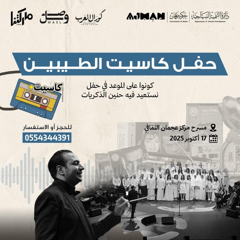The Arab Choir will take you on a nostalgic musical journey, performing a collection of iconic Arabic pop hits that defined the cassette generation. Expect a night filled with sing-along moments, heartfelt nostalgia, and timeless melodies that bring friends and families together in a celebration of simplicity and authentic taste from the 90s era. Cassette Al-Tayebeen Concert – The Arab Choir | Cassette+ Event in Ajman at CF7W+9XR, University Street, Near Khalifa Hospital, Al Jerf, Ajman, United Arab Emirates events Concerts Ajman Culture Center
