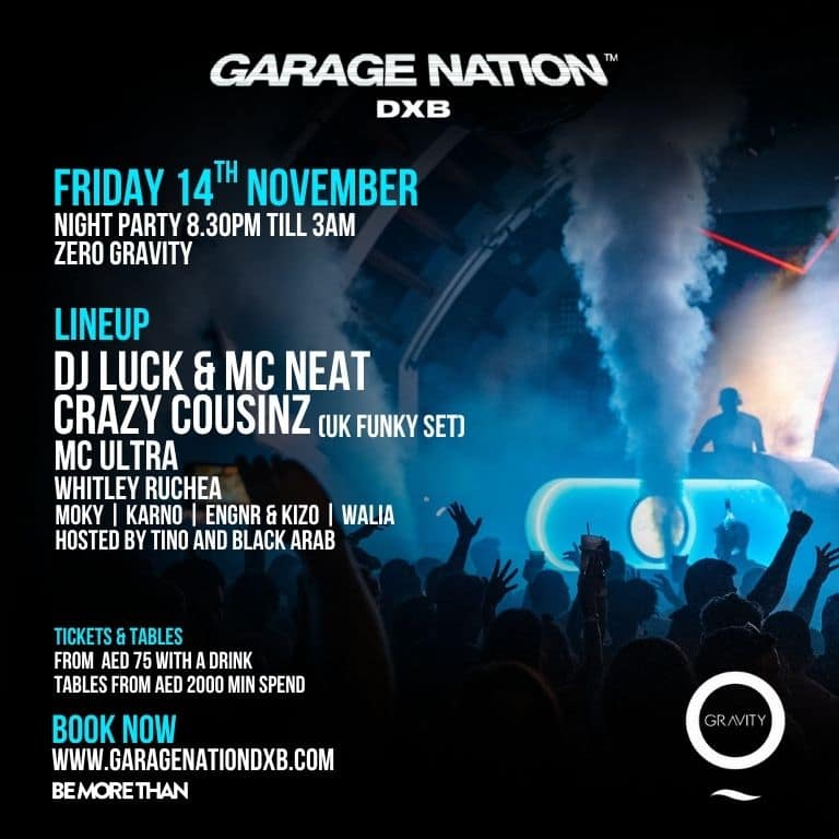 – GARAGE NATION DUBAI RETURNS 14th NOVEMBER! Garage Nation Dubai returns and this time they bring two Legends of the UK Garage Scene, non other than DJ Luck and MC Neat! And because we like to throw in a a little something extra we’re also bringing you UK Funky’s heavyweight DJ Crazy Cousinz. Joining these two huge names will be MC Ultra who teams up with DJ Whitley Ruchea, returning local heroes DJs Moky, Karno, Walia and Engnr and Kizo also bring you all your UKG favourites hosted under the stars from 8:30pm – 3am at Zero Gravity on Friday 14th November by the duo of all duo’s Tino and Black Arab. Tickets are on sale now from 100 AED and Tables from 2000 AED. All tickets include 1 Free Drink if you arrive before 10pm. Garage Nation DXB at Zero Gravity at Zero Gravity Dubai, King Salman Bin Abdulaziz Al Saud Street, Dubai, United Arab Emirates events Nightlife Zero Gravity