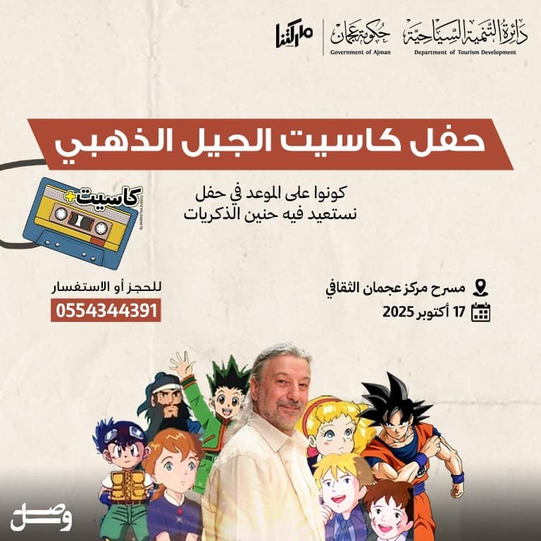 – Enjoy a night to remember as the golden generation gathers with the original singer of Spacetoon songs! Together, we’ll sing the beloved cartoon theme songs from our childhood with the wonderful artist Assem Sukkar.  We look forward to welcoming you to this unforgettable evening, brought to life by Assem Sukkar, as we relive the magic of our childhood cartoon songs, Spacetoon Melodies. Presented by Marketna Events with the official sponsorship of the Ajman Department of Tourism Development. Golden Generation Cassette Concert | Cassette Event + in Ajman at CF7W+9XR, University Street, Near Khalifa Hospital, Al Jerf, Ajman, United Arab Emirates events Concerts Ajman Culture Center