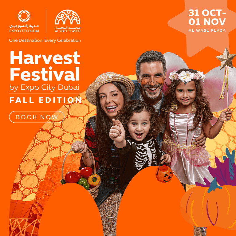 – Step into the magic of Fall at Al Wasl Plaza, where golden leaves, local farms, and playful frights come together. Al Wasl Plaza will be transformed into a rustic, enchanting autumn destination that celebrates the cozy charm of fall and the playful spookiness of Halloween. This special edition of the Harvest Festival invites families to decorate pumpkins, sip warm spiced lattes, and bask in the joy of the season. From fresh seasonal produce, the vibrant retail market with local brands and artisanal treats to whimsical Halloween décor, costumes, and themed activities for all ages, there’s something to delight every visitor. With all activities included* in your ticket, the fun never stops: bounce on colorful bouncy castles, get creative in hands-on workshops, join family races, and follow the Spider Trick-or-Treat trail for lots and lots of candy! This fall, Al Wasl Plaza truly becomes One Destination for Every Celebration. *While Supplies last Harvest Festival-Fall Edition in Dubai at Al Wasl Plaza | Expo City Dubai, Al Wasl Avenue, Dubai, United Arab Emirates events Festival Al Wasl Plaza, Expo City Dubai