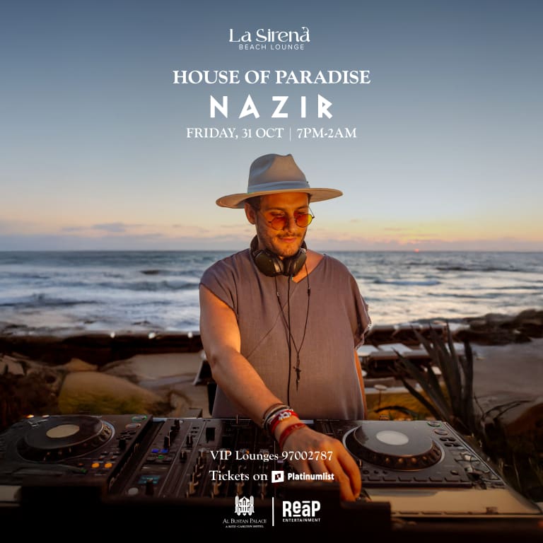 Presented by Reap Entertainment. Municipality Number: 02/756/2025 House Of Paradise Present DJ Nazir at La Sirena Beach Lounge at HJ88+V6 Muscat events Nightlife La Sirena Beach Lounge, Al Bustan Palace, a Ritz Carlton Hotel