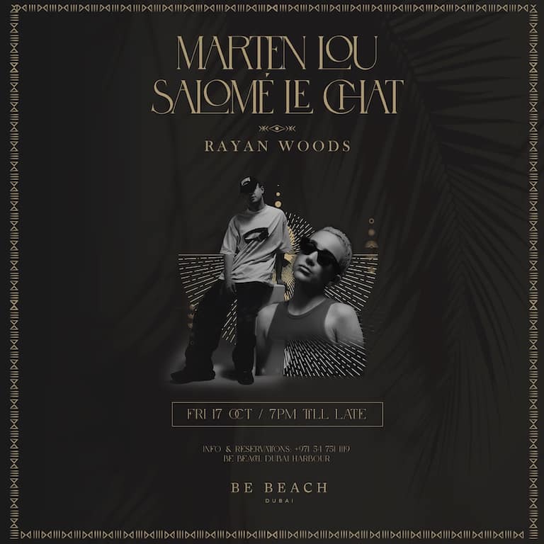 – Join us at Be Beach Dubai Harbour for a night of eclectic beats and high-energy performances with Marten Lou and Salomé Le Chat, two dynamic artists redefining electronic music with their unique styles. Their sets promise a journey of deep, melodic, and groovy sounds that will keep the crowd moving all night long. The evening also features a performance by Rayan Woods, adding his signature touch to the lineup and ensuring an electric atmosphere from beginning to end. Marten Lou & Salomé Le Chat at Be Beach Dubai at 34RH+93 Dubai, United Arab Emirates events Nightlife Be Beach – Dubai