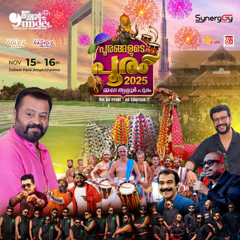 . Pooramgalude Pooram Mmde Thrissur Pooram season 6  UNESCO has recognized Thrissur Pooram as a particularly impressive festival, highlighting its scale and grandeur. Inspired by the rich cultural heritage of Thrissur, a group of individuals from the UAE came together to establish Mmde Thrissur in 2018.  Thrissur pooram “Mother of all Poorams,” one of the largest festivals in Asia, is renowned for its spectacular festival that exemplifies the fusion of art, culture, and spirituality. This vibrant celebration features a magnificent procession of beautifully caparisoned elephants, accompanied by the captivating rhythms of traditional percussion orchestra such as melam and panchavadyam. ‘Mmde Thrissur‘ made history by bringing the grandeur of Thrissur Pooram to Dubai for the first time. This extraordinary event was launched on April 26th 2019 at Bollywood Parks Dubai, ensuring an exceptional experience.. Mmde Thrissur Pooram 2025, Season-6 at Zabeel Park, Zabeel Area, Near Al Jafiliya Metro Station, Za’abeel, Al Kifaf, Dubai, United Arab Emirates events Concerts Zaabeel Park Gate 1 & 3 Suresh Gopi