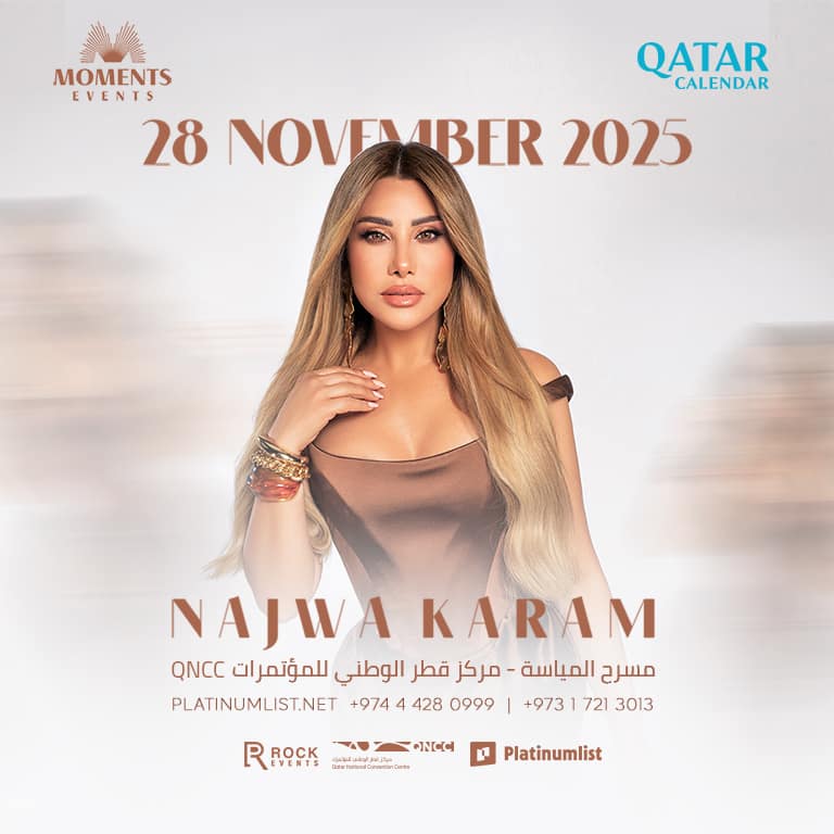 Secure your tickets now and be part of an evening that will captivate your senses, filled with vibrant rhythms and soulful melodies that celebrate Najwa Karam’s iconic legacy! Najwa Karam Live At Al Mayassa Theatre, QNCC 28th of November “Shams El-Ghinnieh” Najwa Karam will dazzle Al Mayassa Theatre, QNCC on 28 November. The Lebanese multi-platinum icon, celebrated for her powerful voice and modern blend of Arabic and Lebanese sounds, has sold over 60 million records worldwide. Known for hits like “Yelaan Elboaad,” “Hayda Haki,” “Khallini Shoufak,” and “Maloun Abu Eleshq,” Najwa remains one of the most influential figures in Arabic music. Secure your tickets now and be part of an evening that will captivate your senses, filled with vibrant rhythms and soulful melodies that celebrate Najwa Karam’s iconic legacy! Najwa Karam Live At Al Mayassa Theatre, QNCC at Qatar National Convention Centre (QNCC), Ar-Rayyan, Qatar events Concerts Qatar National Convention Centre (QNCC) Najwa Karam