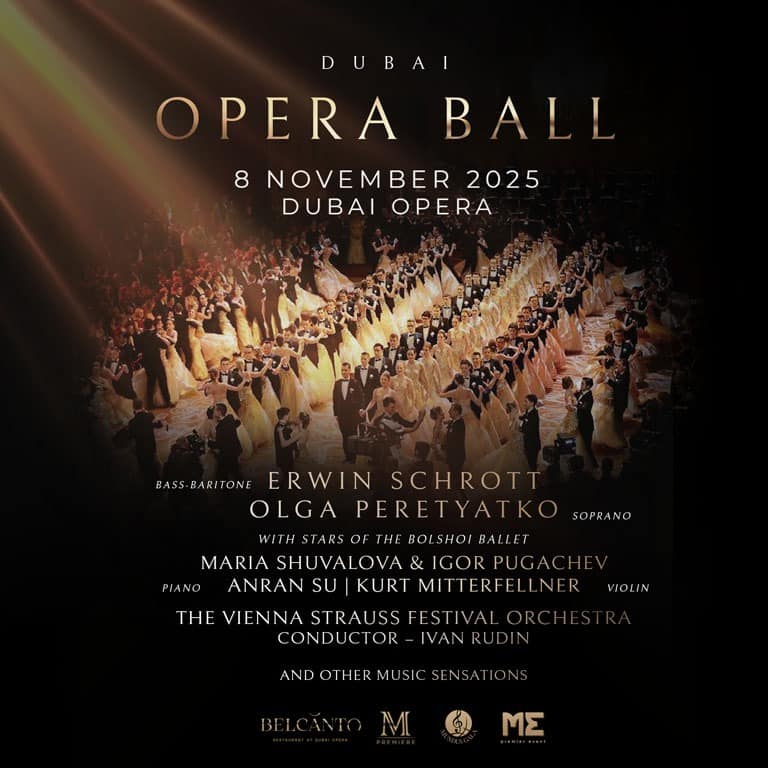 The Dubai Opera Ball 2025 Step into a world of grace and grandeur as M Premiere and Mundus Gala present the Fourth Annual Dubai Opera Ball on November 8, 2025, at the magnificent Dubai Opera. A dazzling highlight of Dubai’s cultural season, this exceptional evening unites the splendor of classical music, ballet, and timeless tradition in one unforgettable celebration of beauty and art. This year’s gala promises an evening of enchantment with an extraordinary lineup of internationally celebrated artists. Soprano Olga Peretyatko, acclaimed for her radiant voice and spellbinding presence on the world’s foremost opera stages, will perform alongside the magnetic bass-baritone Erwin Schrott, renowned for his commanding charisma and masterful interpretations of Mozart and Verdi. Adding to the splendor of the evening, the stars of the Bolshoi Ballet — Maria Shuvalova and Igor Pugachev — will grace the stage with breathtaking performances that capture the essence of classical beauty and artistic excellence. The program will also feature nine-year-old piano prodigy Anran Su, whose extraordinary talent has captivated audiences worldwide, and violinist Kurt Mitterfellner, whose expressive artistry and technical brilliance promise to enchant music lovers. The Vienna Strauss Festival Orchestra, under the distinguished baton of conductor Ivan Rudin, will present a symphonic journey through the finest classical masterpieces. Inspired by the golden age of Viennese music, the orchestra will fill the evening with luminous melodies and sweeping waltzes, immersing guests in an atmosphere of refinement and grandeur. Continuing its cherished tradition, the ball will open with an exquisite debutante performance, featuring young ladies and gentlemen from 30 countries. Dressed in resplendent gowns and immaculate tuxedos, they will revive the timeless elegance of European high society, gliding gracefully across the stage in a moment of pure beauty and poise. As the night draws to a close, the celebration will continue with an exclusive DJ performance, inviting guests to dance the night away beneath the sparkling lights of Dubai Opera. The Dubai Opera Ball is more than an event — it is a celebration of art, culture, and refinement, where every detail is crafted to perfection. With its illustrious program, world-renowned performers, and an aura of grandeur, this unforgettable evening promises to be one of the most elegant and talked-about nights of the year. The Dubai Opera Ball 2025 at Dubai Opera, Sheikh Mohammed bin Rashid Boulevard, Dubai, United Arab Emirates events Classical Events Dubai Opera