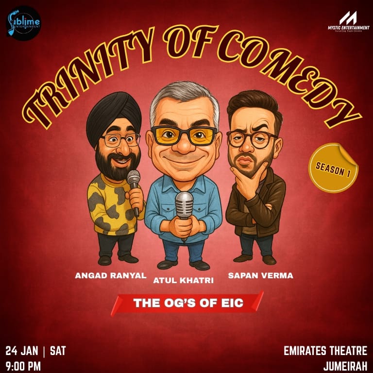 – Sublime Entertainment proudly brings to you a new IP with the OG’s of EIC under one roof. Catch The Trinity of Comedy Season 1, live on 24th January at Emirates Theatre Jumeirah from 9 pm onwards, featuring none other than Atul Khatri, Sapan Verma, and Angad Ranyal. It will be a triple laughter riot as these veteran comics are going to entertain you all with their different styles of comedy and storytelling. Each artist will have a brand new set of jokes, and you do not want to miss watching them live. Trinity of Comedy- Season 1 ft. Atul Khatri, Sapan Verma and Angad Ranyal in Dubai at Emirates International School, Jumeirah, Al Thanya Street, Dubai, United Arab Emirates events Comedy Events Dubai – Emirates International School Auditorium Atul Khatri